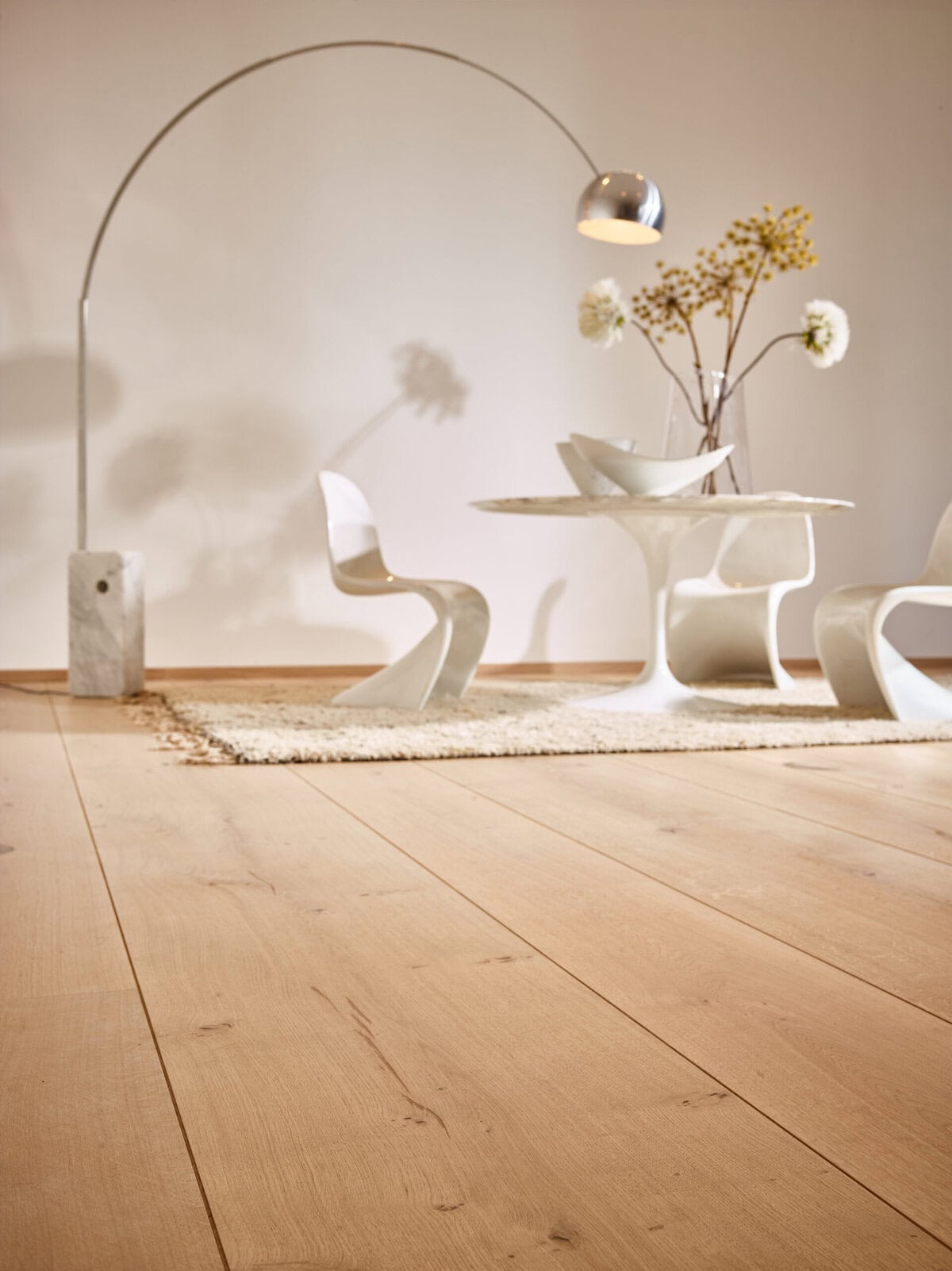 Oak Vanilla is an ode to light. Its journey begins in the forests of Europe, where select oak is patiently seasoned by time. Softly bleached to reveal its quiet clarity, the wood is refined by artisans who preserve every natural rhythm of the grain. Offered in both wide planks and herringbone, its style is minimalist and enduring. From one collection to the next, this signature floor is reinterpreted through craftsmanship, yet always remains true to its serene elegance.
